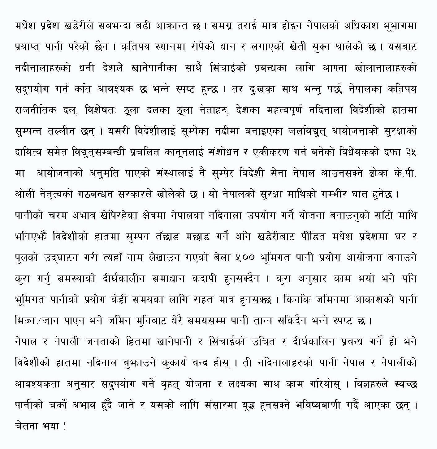 शनिबार सामाजिक संजालमार्फत रावलले सरकारले नदी र खोलानालाको धनी देश भए पनि त्यसको उचित उपयोग गर्ने दीर्घकालीन योजना नबनाउनु गम्भीर लापरबाही भएको बताएका हुन् । उनले सरकार आफ्नै स्रोत साधन विदेशीलाई सुम्पन प्रतिस्पर्धामा लागेको आरोप लगाए ।
