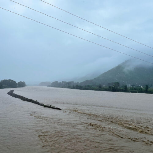 दाङको राप्ती गाउँपालिका–१ स्थित भालुबाङबाट देखिएको अविरल वर्षापछि उर्लिएको राप्ती नदी । तस्बिरः कुलदीप न्यौपाने/रासस