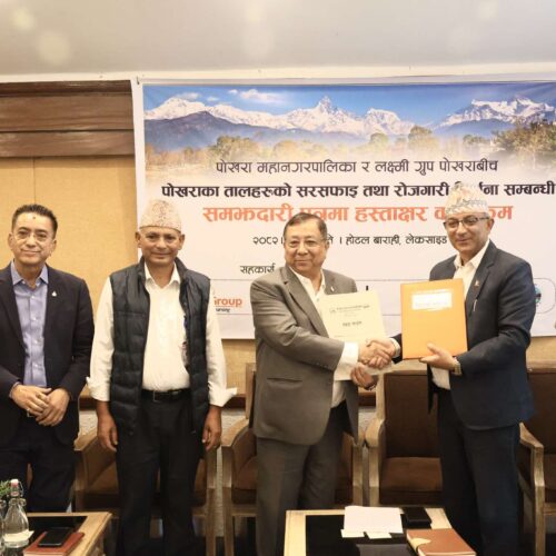 पोखरा । पोखरा महानगरपालिका र लक्ष्मी ग्रुप फाउन्डेसन (लक्ष्मी ग्रुप) बीच वातावरण तथा पर्यावरण संरक्षणसँगै महानगर क्षेत्रमा रहेका तालहरूको सरसफाइ एवं रोजगारी सिर्जना सम्बन्धी समझदारी भएको छ ।
