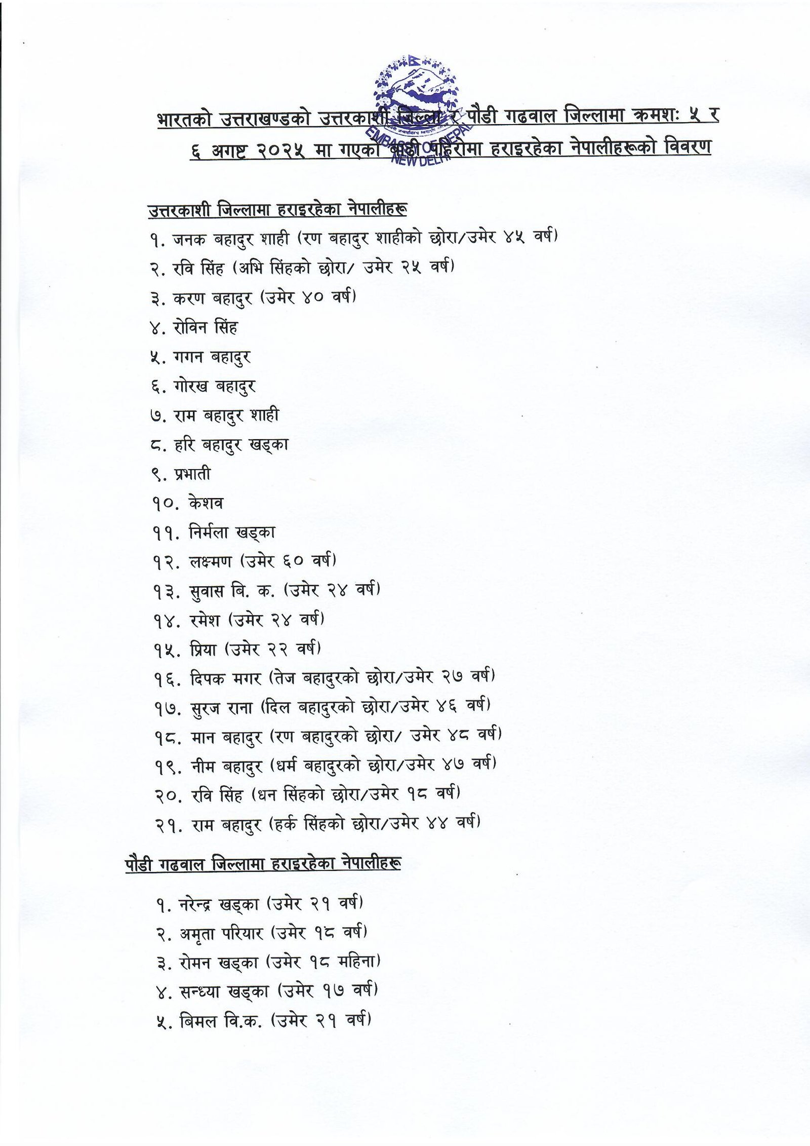 भारतको उत्तराखण्ड स्थानीय प्रशासनद्वारा आज ११ अगष्ट २०२५ मा उपलब्ध गराइएको जानकारी अनुसार उत्तराखण्डको उत्तरकाशी जिल्ला र पौडी गढवाल जिल्लामा क्रमशः ५ र ६ अगष्ट २०२५ मा गएको बाढी पहिरोमा हराइरहेका नेपालीहरूको विवरण @MofaNepal @Arzuranadeuba pic.twitter.com/E0zRm8kaRi