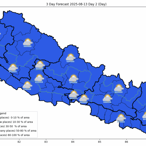 देशका अधिकांश स्थानमा मध्यम वर्षाको सम्भावना रहेको तथा मधेस प्रदेशलगायत कोशी, वाग्मती, गण्डकी, लुम्बिनी र सुदूरपश्चिम प्रदेशका केही स्थानमा भारी वर्षा र एकदुई स्थानमा मुसलधारे वर्षाको पनि सम्भावना छ । कर्णाली प्रदेशका एकदुई स्थानमा भारी वर्षाको सम्भावना छ ।