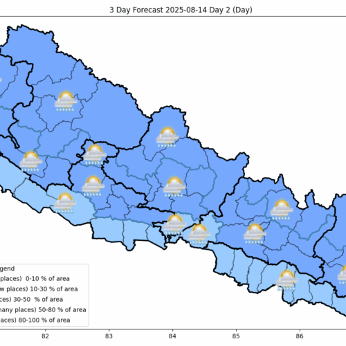 आज दिउँसो लुम्बिनी, कर्णाली र सुदूरपश्चिम प्रदेशलगायत पहाडी भागमा साधारणतया बदली हुने तथा बाँकी भागमा आंशिक बदली रहनेछ । महाशाखाका अनुसार लुम्बिनी, कर्णाली र सुदूरपश्चिम प्रदेशका पहाडी र तराईलगायत पहाडी भागका केही स्थानमा र मधेस प्रदेशका केही स्थानमा मध्यम वर्षाको सम्भावना छ ।