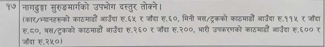 जसअनुसार नागढुंगा सुरुङमार्गमार्फत कार तथा भ्यानहरूले काठमाडौं आउँदा ६५ रुपैयाँ र जाँदा ६० रुपैयाँ दस्तुर तिर्नुपर्नेछ ।