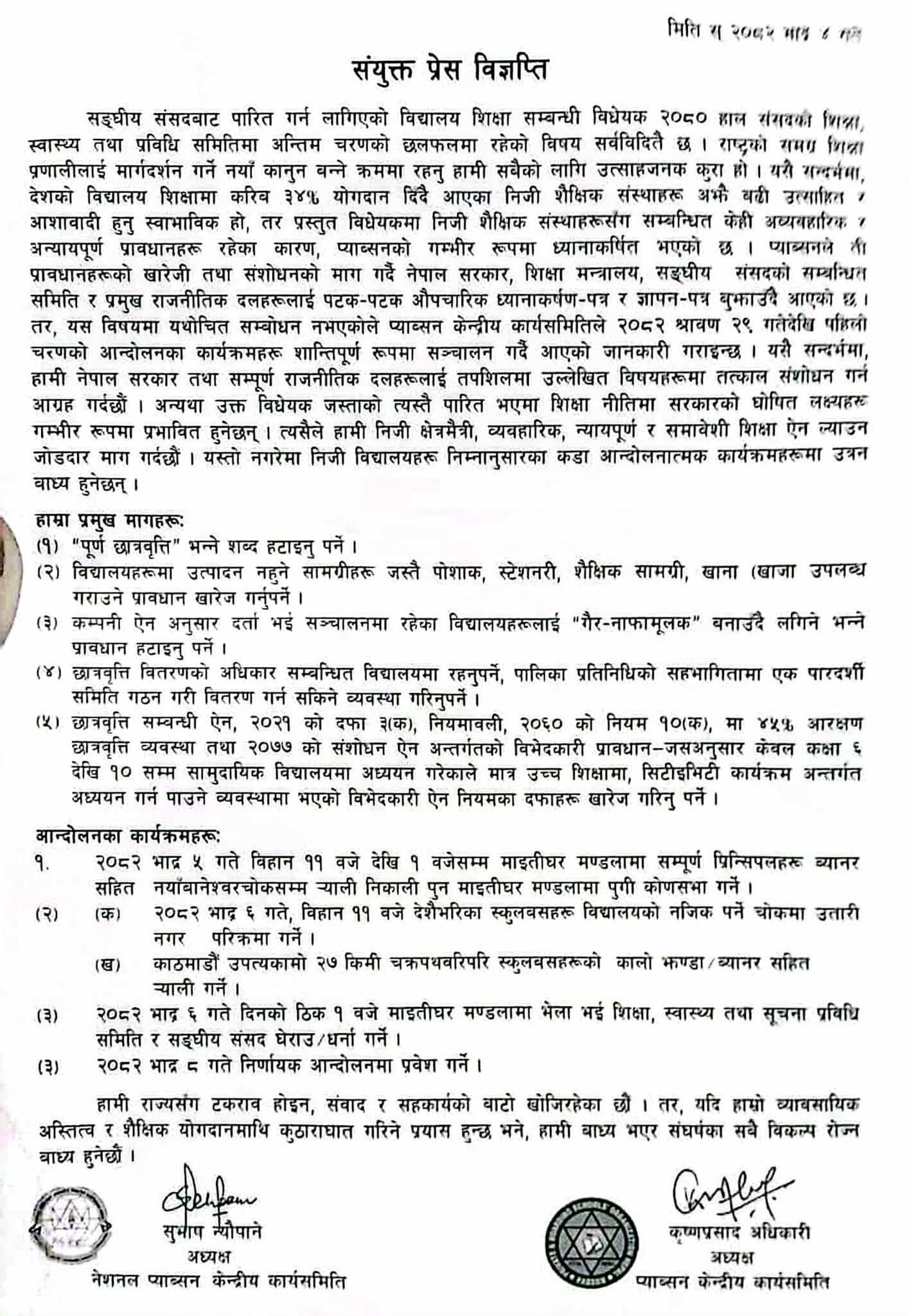 त्यस्तै छात्रवृत्ति वितरणको अधिकार सम्बन्धित विद्यालयमै रहनुपर्ने माग गरेका छन् । उनीहरुले भदौ ५ गते बिहान ११ देखि १ बजेसम्म माइतीघर मण्डलादेखि नयाँबानेश्वर चोकसम्म प्रिन्सिपलहरूले ब्यानरसहित र्याली गर्ने र कोणसभा गर्ने, भदौ ६ गते देशभर स्कुल बस उतारेर नगर परिक्रमा गर्ने तथा काठमाडौँको चक्रपथ वरिपरि कालो झन्डा/ब्यानरसहित र्याली गर्ने बताएका छन् । यसैगरी भदौ ८ गते निर्णायक आन्दोलनमा प्रवेश गर्ने घोषणा गरेका छन् ।