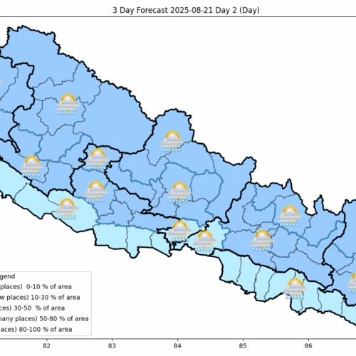 त्यसैगरी, आज राति कोशी, मधेस, वाग्मती र गण्डकी प्रदेशका केही स्थानमा मध्यम वर्षाको सम्भावना छ । कोशी, वाग्मती र गण्डकी प्रदेशका पहाडी भेगका एकदुई स्थानमा भारी वर्षाको सम्भावना छ ।