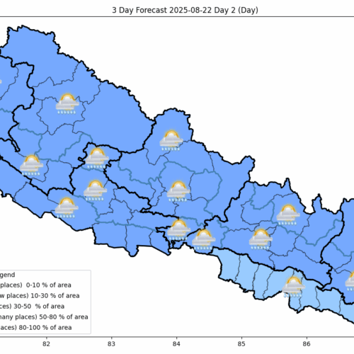 आज दिउँसो देशभर साधारणतया बदली हुनेछ । कोशी, वाग्मती, गण्डकी र लुम्बिनी प्रदेशलगायत देशका पहाडी भेगका केही स्थानमा र तराईका केही भागमा मध्यम वर्षाको सम्भावना छ । कोशी, वाग्मती र गण्डकी प्रदेशका पहाडी भेग तथा लुम्बिनी प्रदेशका तराई एवं पहाडी क्षेत्रका एकदुई स्थानमा भारी वर्षाको सम्भावना छ ।