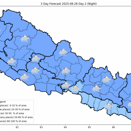 त्यसैगरी, आज राति देशभर साधारणतया बदली हुनेछ । देशका पहाडी भागका धेरै स्थानमा मध्यम वर्षा हुनेछ । गण्डकी, कर्णाली र सुदूरपश्चिम प्रदेशका पहाडी क्षेत्रका साथै लुम्बिनी र कोशी प्रदेशका तराई भगका एक–दुई स्थानमा भारी वर्षाको सम्भावना छ ।