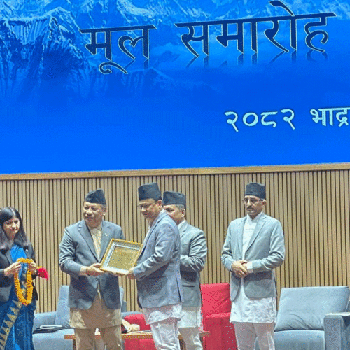 निजामती सेवा दिवस २०८२ का अवसरमा आज आयोजित कार्यक्रममा उपप्रधानमन्त्री एवं सहरी विकासमन्त्री प्रकाशमान सिंहले उनलाई प्रमाणपत्रसहित सो पुरस्कार अर्पण गरेका हुन्