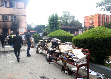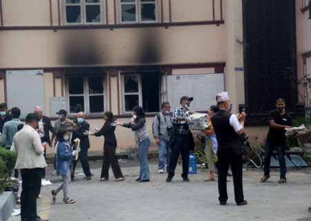 काठमाडौँमा मङ्गलबार भएको तोडफोड र आगजनीबाट जलेर नष्ट हुन बाँकी रहेका सर्वोच्च अदालत भित्रका कागजपत्र, मिसिल र फाइलहरु बुधबार सङ्कलन गरिँदै । तस्बिरः नवीन पौडेल/रासस