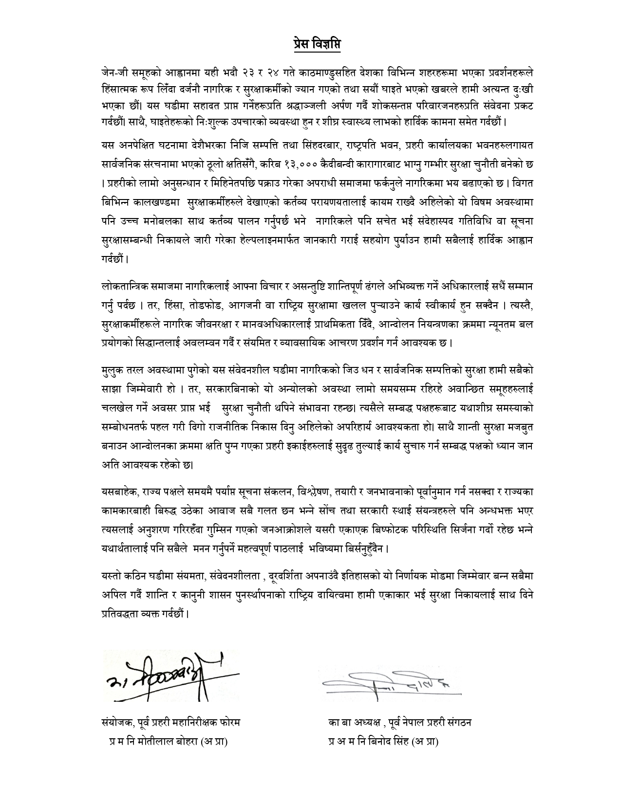 विज्ञप्तिमा भनिएको छ, ‘लोकतान्त्रिक समाजमा नागरिकलाई आफ्ना विचार र असन्तुष्टि शान्तिपूर्ण ढंगले अभिव्यक्त गर्ने अधिकारलाई सधैंसम्म गर्नु पर्दछ । तर, हिंसा, तोडफोड, आगजनी वा राष्ट्रिय सुरक्षामा खलल पुयाउने कार्य स्वीकार्य हुन सक्दैन । त्यस्तै, सुरक्षाकर्मीहरूले नागरिक जीवनरक्षा र मानवअधिकारलाई प्राथमिकता दिँदै, आन्दोलन नियन्त्रणका क्रममा न्यूनतम बल प्रयोगको सिद्धान्तलाई अवलम्वन गर्दै र संयमित र व्यावसायिक आचरण प्रदर्शन गर्न आवश्यक छ । मुलुक तरल अवस्थामा पुगेको यस संवेदनशील घडीमा नागरिकको जिउ धन र सार्वजनिक सम्पत्तिको सुरक्षा हामी सबैको साझा जिम्मेवारी हो । तर, सरकारबिनाको यो अन्योलको अवस्था लामो समयसम्म रहिरहे अवान्छित समूहहरुलाई चलखेल गर्ने अवसर प्राप्त भई सुरक्षा चुनौती थपिने संभावना रहन्छ। त्यसैले सम्बद्ध पक्षहरूबाट यथाशीघ्र समस्याको सम्बोधनतर्फ पहल गरी दिगो राजनीतिक निकास दिनु अहिलेको अपरिहार्य आवश्यकता हो ।’