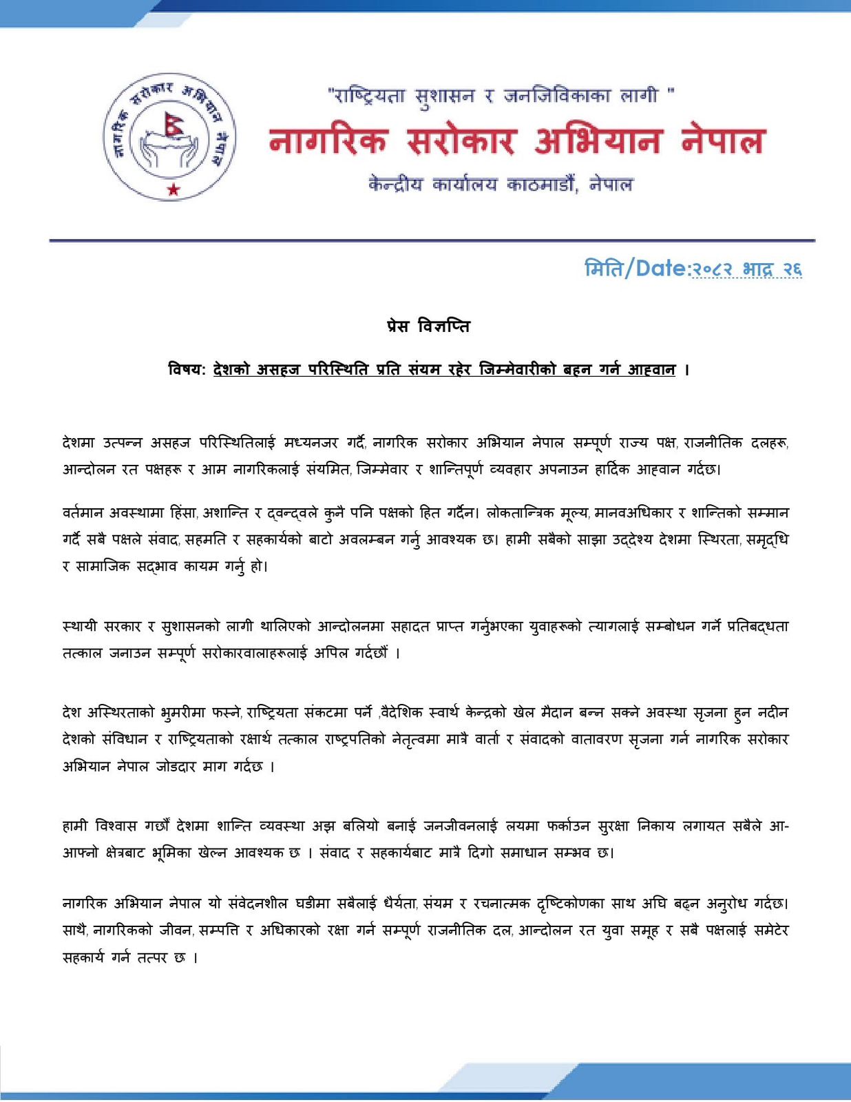 देशको असहज परिस्थितिमा सबैलाई जिम्मेवार र शान्तिपूर्ण व्यवहार अपनाउन नागरिक सरोकार अभियानको आह्वान