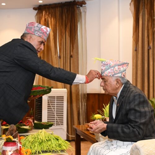 काठमाडौं । राष्ट्रपति रामचन्द्र पौडेलले गुरु पुरोहितको हातबाट दसैंको टीका, जमरा, प्रसाद र आशिर्वाद ग्रहण गरेका छन् । राष्ट्रपति कार्यालय शीतलनिवासमा बिहीबार राष्ट्रपति पौडेलले दसैंको शुभ साइत ११ बजेर ५३ मिनेटमा टीका प्रसाद ग्रहण गरेका हुन् ।