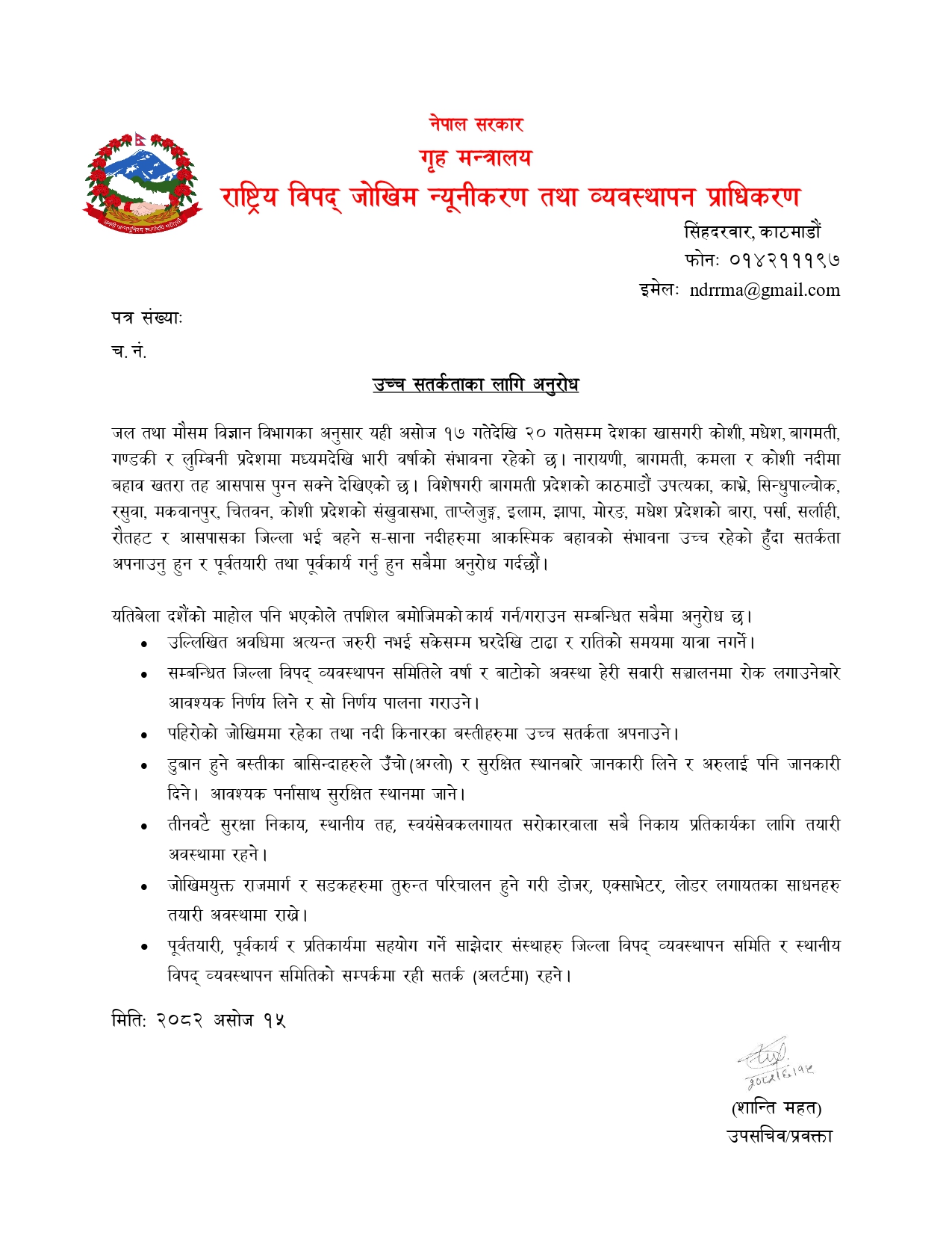 जल तथा मौसम विज्ञान विभागले असोज १७ गतेदेखि २० गतेसम्म देशका खासगरी कोसी, मधेस, बागमती, गण्डकी र लुम्बिनी प्रदेशमा मध्यमदेखि भारी वर्षाको सम्भावना छ। यस क्रममा नारायणी, बागमती, कमला र कोसी नदीमा बहाब खतरा तह आसपास पुग्न सक्ने देखिएको बताएपछि प्राधिकरणले यस्तो बताएको हो ।