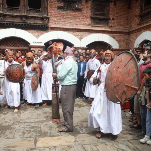 दरबारबाट पमा नायो (प्रधान नाइके)को नेतृत्वमा मल्लकालीन सिपाहीको भेषमा जात्रालुहरू टाउकोमा फलामे टोपी, हातमा तरबार, खुँडा र ढाल बोकेर निस्केका थिए । ती सिपाहीले युद्ध कौशल पनि प्रदर्शन गरेका थिए ।