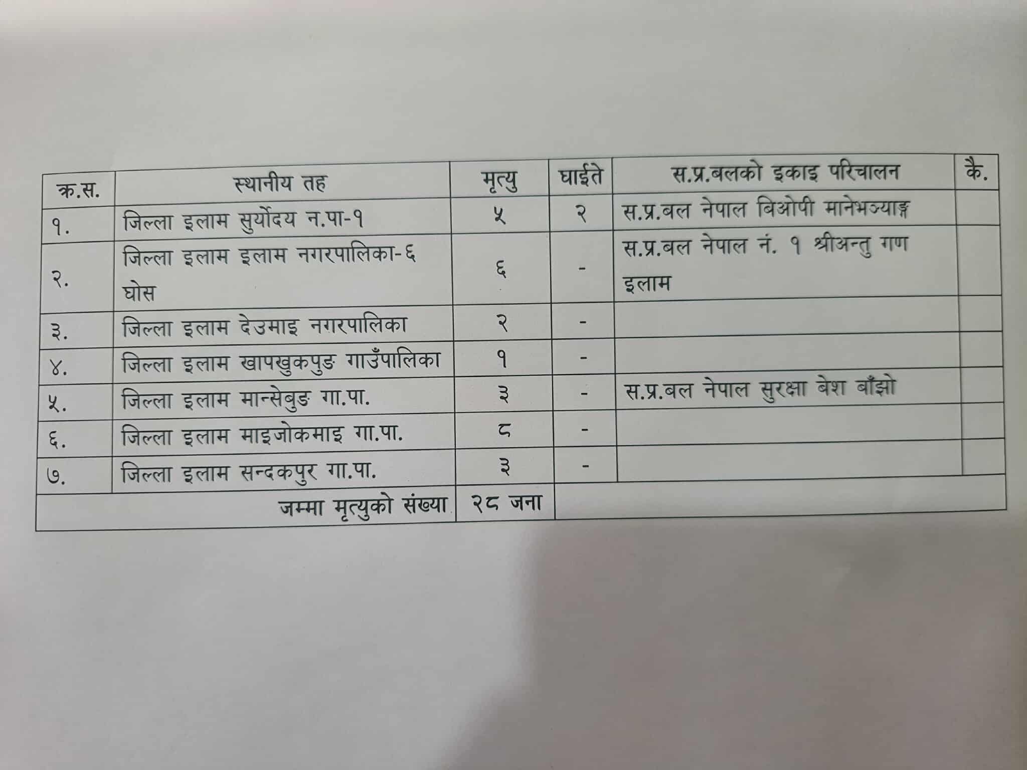 इलामको सूर्योदय नगरपालिका १ मा ५ जना, इलाम नगरपालिका ६ घोसमा ६ जना, देउमाइ नगरपालिकामा २ जना, खापखुकपुङ गाउँपालिकामा १ जना, मान्सेबुङ गाउँपालिकामा ३ जना, माइजोकमाइ गाउँपालिकामा ८ जना र सन्दकपुर गाउँपालिकामा ३ गरी २८ जनाको मृत्यु भएको छ । इलाममा पाँच जना अझै बेपत्ता छन् ।