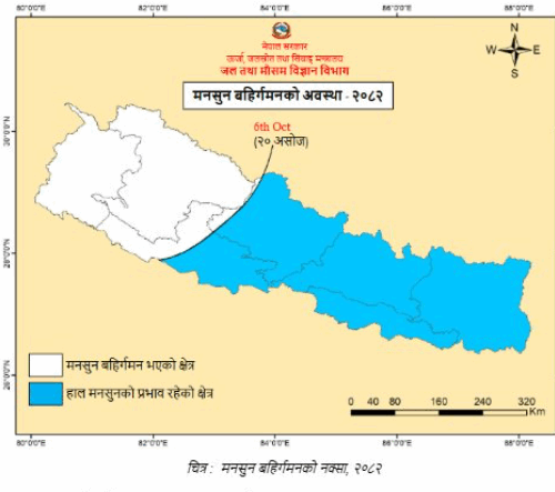 काठमाडौं । यसवर्षको मौसम सुदूरपश्चिम, कर्णाली र लुम्बिनी प्रदेशको धेरै स्थानबाट बाहिरिएको छ । जल तथा मौसम पूर्वानुमान महाशाखाका अनुसार गण्डकी प्रदेशको पश्चिमी भूभागको थोरै स्थानहरूबाट पनि असोज २० देखि मनसुन बाहिरिएको हो ।