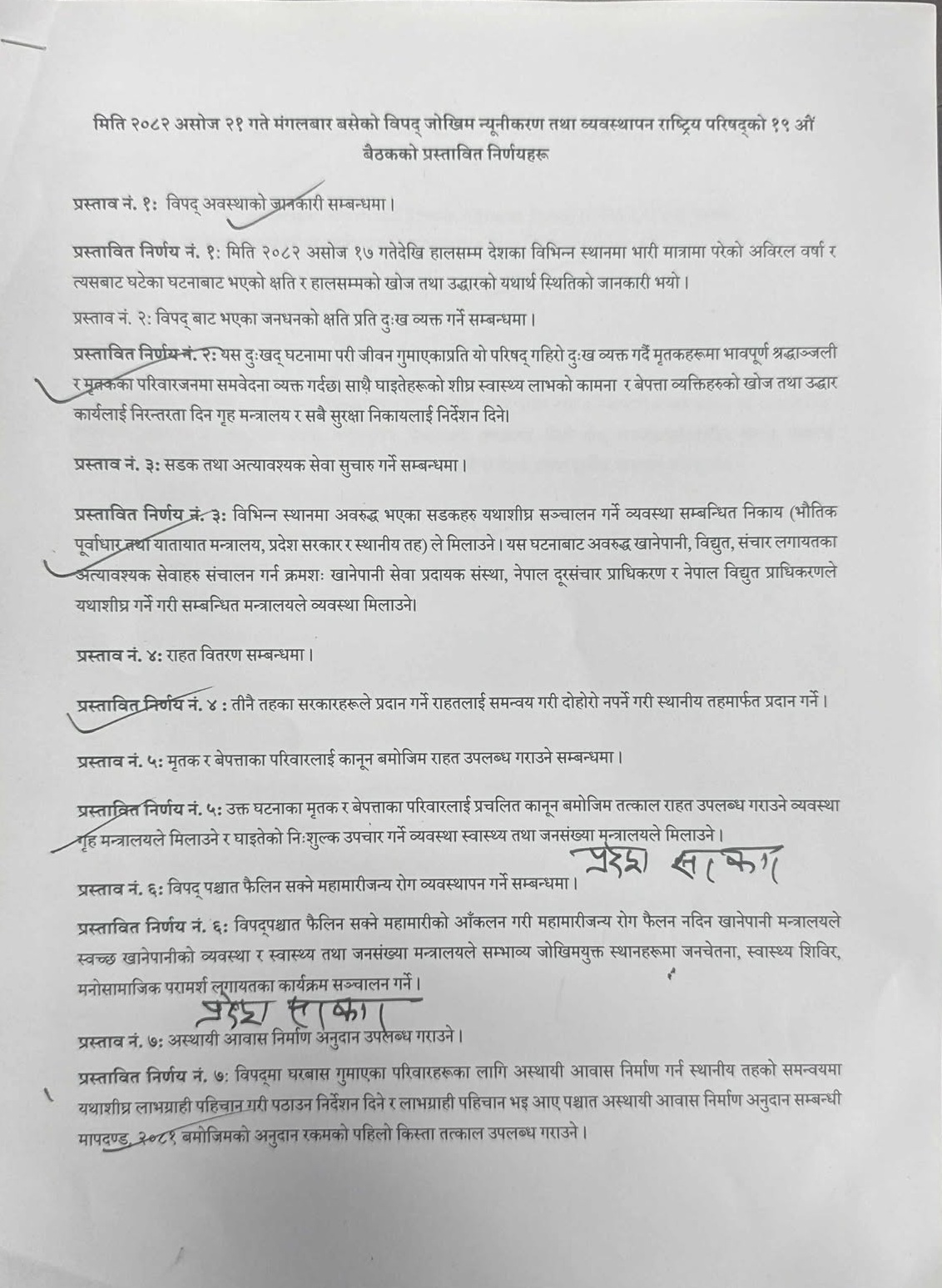 प्रधानमन्त्री एवं परिषद्का अध्यक्ष सुशीला कार्कीको अध्यक्षतामा मंगलबार बसेको राष्ट्रिय विपद् जोखिम न्यूनीकरण तथा व्यवस्थापन राष्ट्रिय परिषद्को बैठकले बाढी–पहिरोबाट घरबास गुमाएकालाई अस्थायी आवास निर्माणका लागि अनुदान दिने निर्णय गरेको हो ।