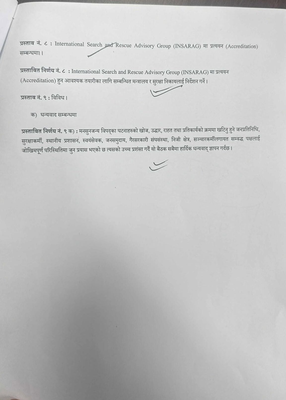 बैठकले तीनै तहका सरकारहरूले प्रदान गर्ने राहतलाई समन्वय गरी दोहोरो नपर्ने गरी स्थानीय तहमार्फत प्रदान गर्ने, मृतक र बेपत्ताका परिवारलाई कानून बमोजिम राहत उपलब्ध गराउने निर्णय गरेको छ ।