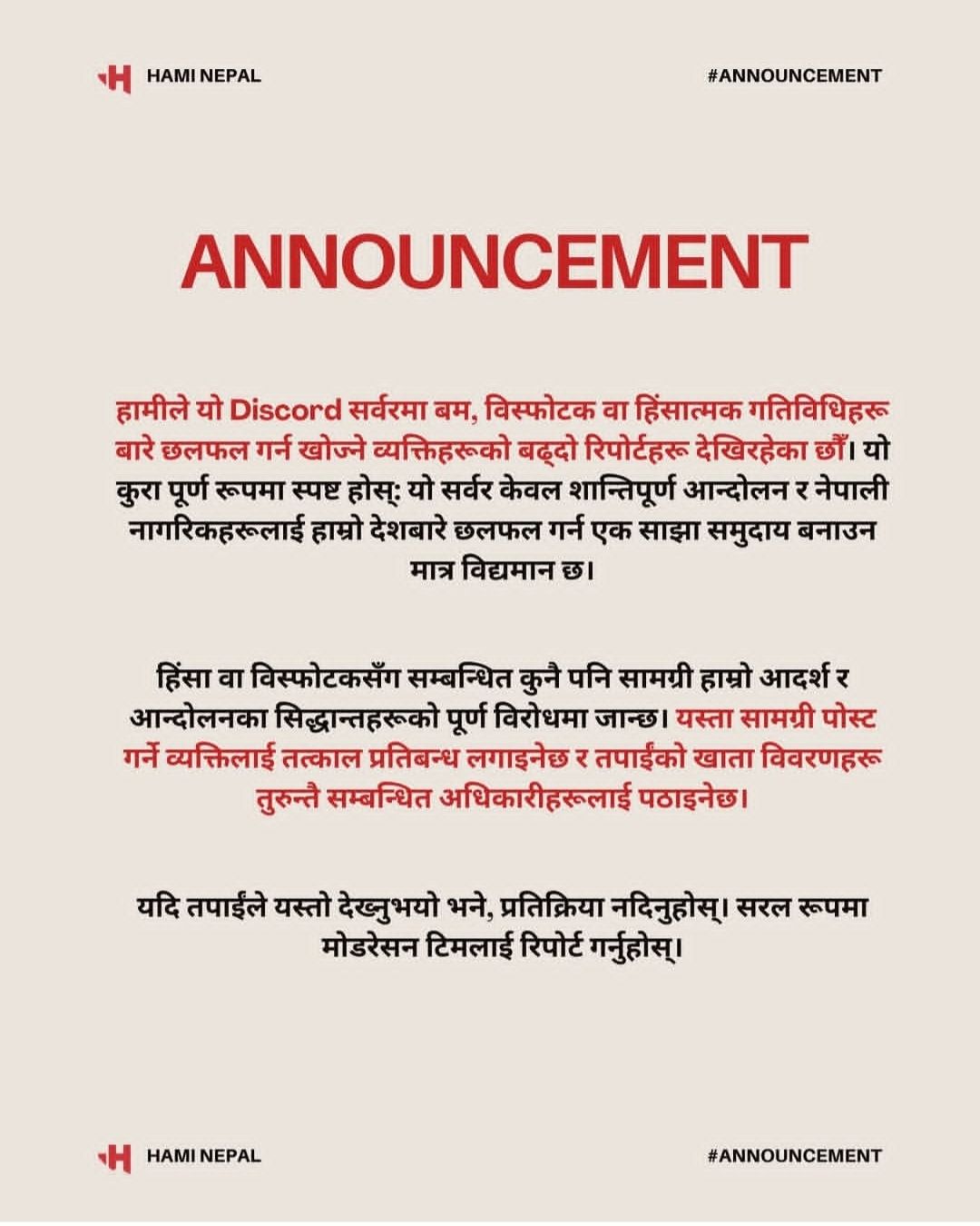 उनले भनेका छन्, ‘हामीले यो डिस्कर्ड सर्भरमा बम, विस्फोटक वा हिंसात्मक गतिविधिबारे छलफल गर्न खोज्ने व्यक्तिहरूको बढ्दो रिपोर्ट देखिरहेका छौँ । यो सर्भर केवल शान्तिपूर्ण आन्दोलन र नेपाली नागरिकहरूलाई हाम्रो देशबारे छलफल गर्न एक साझा समुदाय बनाउनका लागि हो । यस्ता सामग्री पोस्ट गर्ने व्यक्तिलाई तत्काल प्रतिबन्ध लगाइनेछ र तपाईंको खाता विवरणहरू तुरुन्तै सम्बन्धित अधिकारीहरूलाई पठाइनेछ ।’