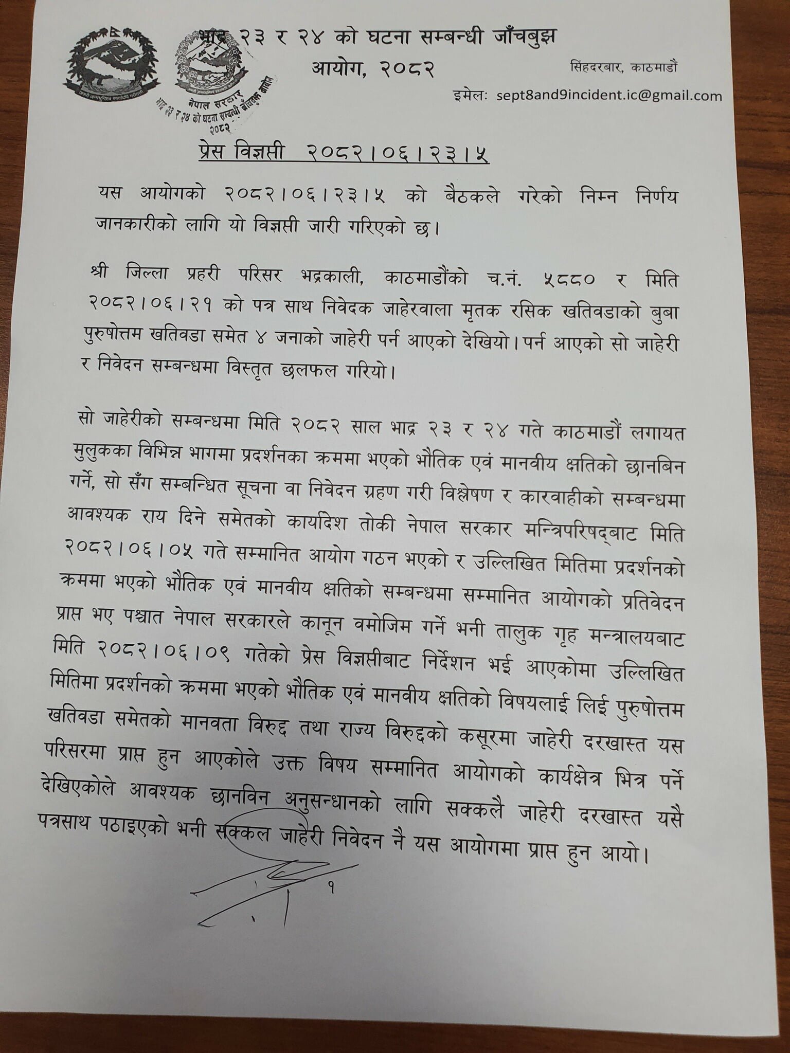 जेनजी प्रदर्शनको क्रममा भएको भौतिक एवं मानविय क्षतिको विषयलाई लिएर आन्दोलनमा मृत्यु भएका रसिक खतिवडाका बुबा पुरूषोत्तम खतिवडा लगाएत अन्य ४ जनाले जिल्ला प्रहरी परिसर काठमाडौंमा सोमबार किटानी जाहेरी दिएका थिए ।