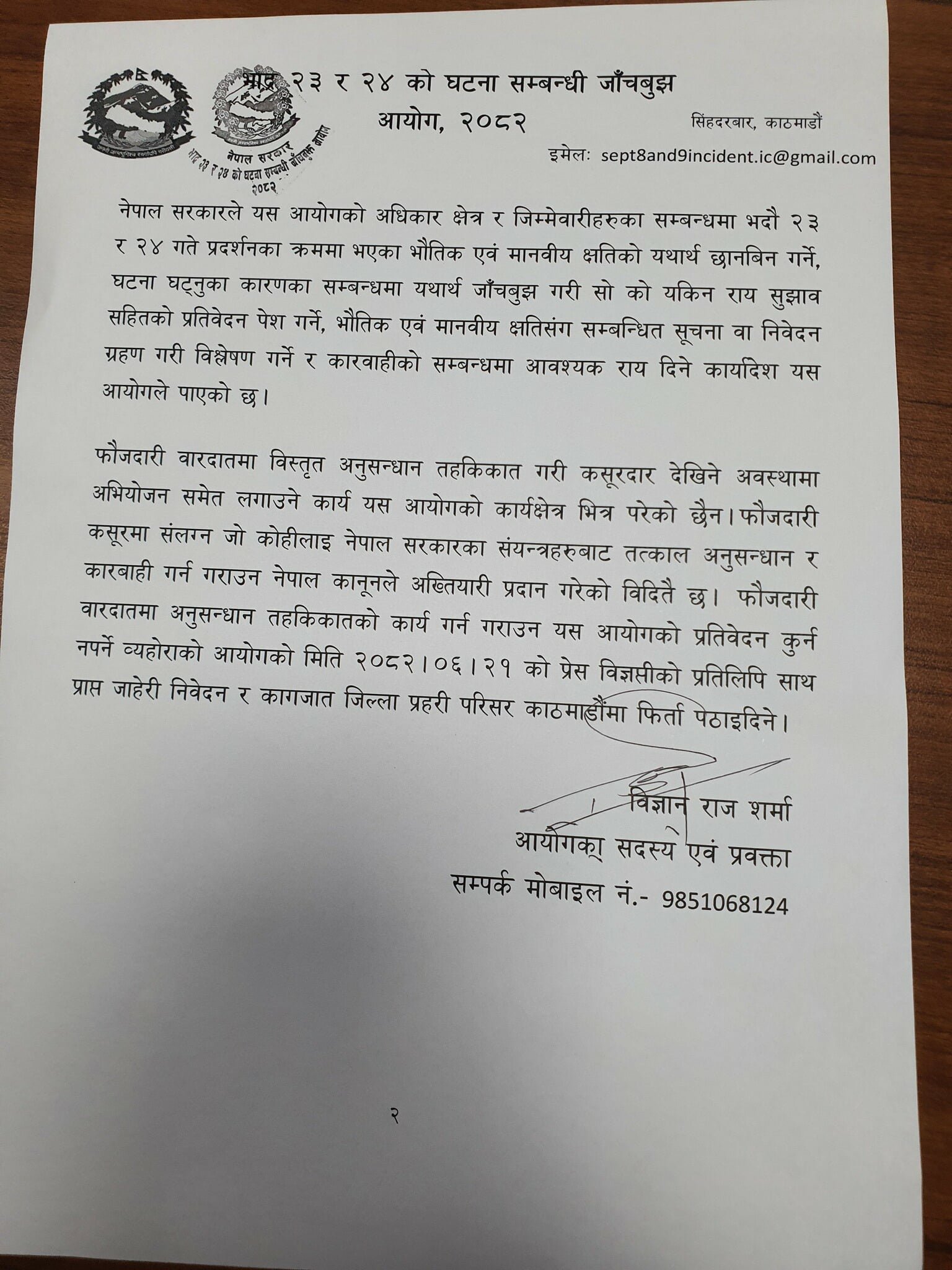 काठमाडौं । गत भदौ २३ र २४ गतेको घटना जाँचबुझ आयोगले पूर्वप्रधानमन्त्री केपी ओली र पूर्वगृहमन्त्री रमेश लेखकविरूद्ध परेको जाहेरी आफ्नो क्षेत्राधिकारमा नपर्ने भन्दै प्रहरीमा फिर्ता पठाएको छ ।