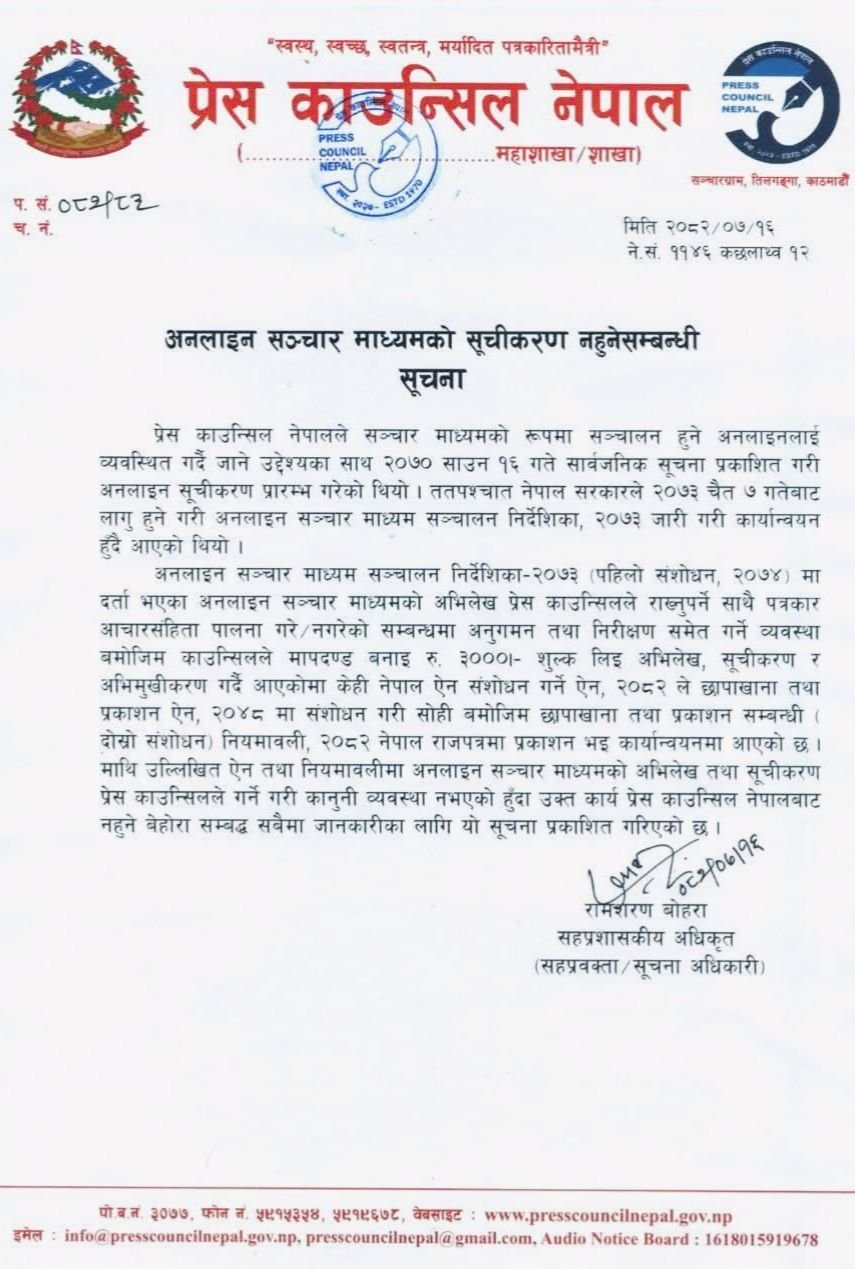 २०७० सालदेखि अनलाइन मिडियालाई व्यवस्थित गर्न थालेको प्रेस काउन्सिलले त्यसपछि २०७३ मा लागू भएको अनलाइन सञ्चार माध्यम सञ्चालन निर्देशिका र त्यसको २०७४ को पहिलो संशोधनअनुसार सूचीकरण गर्दै आएको थियो ।