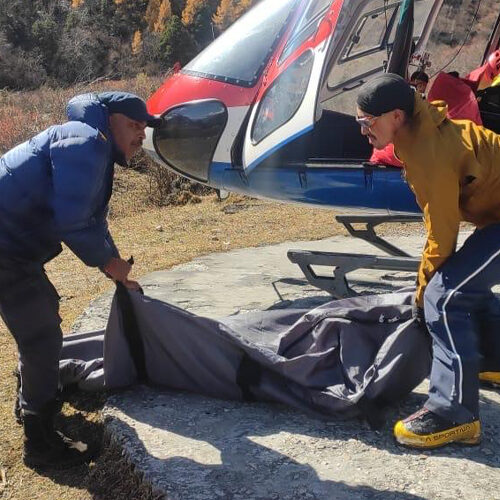 आरोहीको शव हेलिकोप्टरमार्फत सामागाउँ ल्याइएको छ । पाङबारीे हिमालबाट फर्कने क्रममा तीन इटालियन नागरिक र एक नेपाली सहयोगी गत बुधबारदेखि पहिलो शिविर र आधार शिविरमा अलपत्र परेका थिए । फरिनातो र गापुटो हिमाल आरोहण गर्न नसकेपछि फर्कने क्रममा हिमपातका कारण अलपत्र परेका बताइएको छ ।