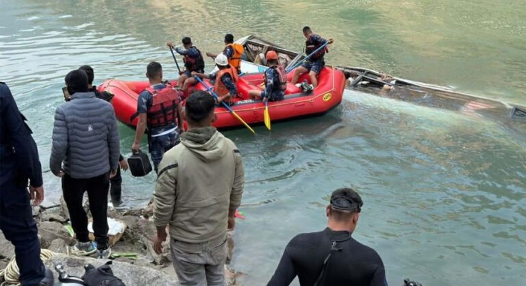 सुरक्षाकर्मीको टोली उद्धारमा खटिएको छ । सडकबाट खसेको बस नदीमा डुबेको छ । अन्य यात्रुहरुको सशस्त्र प्रहरीको गोताखोर टोलीले खोजी गरिरहेको छ ।