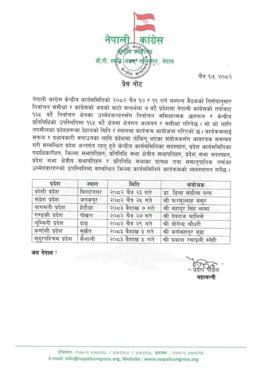 चैत १० र ११ गते बसेको केन्द्रीय कार्यसमितिको बैठकको निर्णयानुसार निर्वाचन समीक्षा र कांग्रेसको अबको बाटो सन्दर्भमा ७ वटै प्रदेशमा उम्मेदवारहरुसँग निर्वाचन समीक्षात्मक छलफल र केन्द्रीय प्रतिनिधिको उपस्थितिमा १६५ वटै क्षेत्रमा क्षेत्रगत अध्ययन र समीक्षा गर्ने भएको हो ।