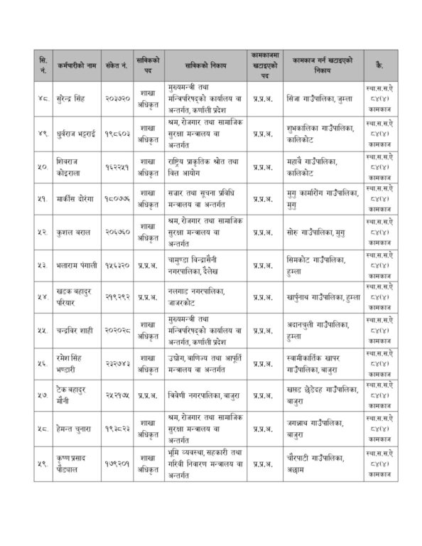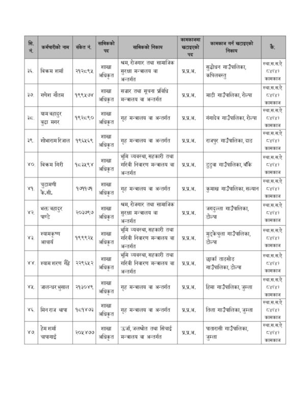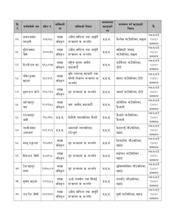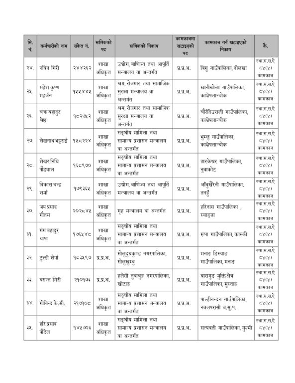 मन्त्रालयले बिहीबार नेपाल प्रशासन सेवा, सामान्य प्रशासन समूह, राजपत्राकिंत तृतीय श्रेणी, शाखा अधिकृत वा सो सरहका कर्मचारीलाई रिक्त स्थानमा खटाएको हो । यी कर्मचारीहरूलाई विभिन्न मन्त्रालय र निकायबाट पालिकाहरूमा पठाइएको छ ।