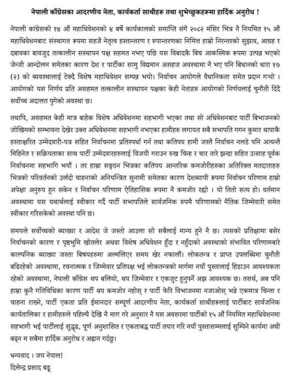 उनले वर्तमान अवस्थामा पार्टीलाई थप बलियो, जिम्मेवार र एकतावद्ध बनाउने पक्षमा पहल गर्न पार्टीका नेता, कार्यकर्ता तथा शुभेच्छुकसँग आग्रह गरेका छन् । बडूले १४औँ महाधिवेशनको कार्यकाल गत मंसिरमै सकिए पनि नियमित महाधिवेशन हुन नसक्दा तत्कालीन नेतृत्वको असहमतिबीच विशेष महाधिवेशन भएको उल्लेख गरेका छन् ।