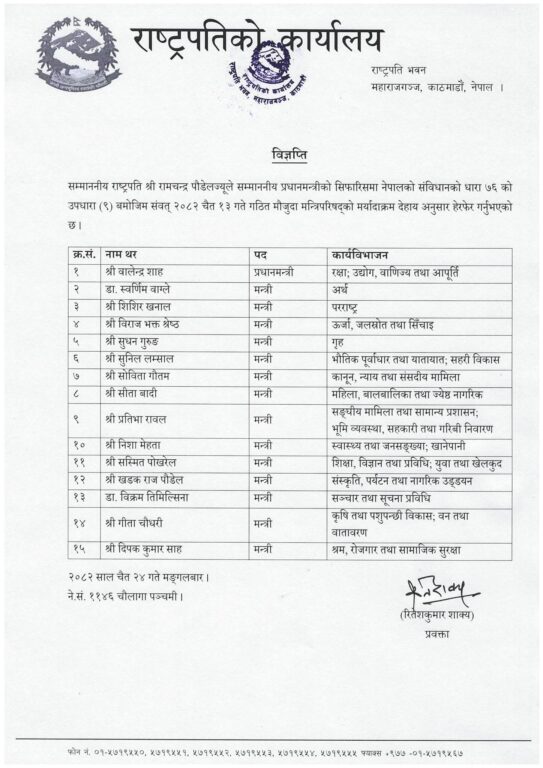 काठमाडौँ । प्रधानमन्त्री बालेन साहले मन्त्रिपरिषद्को मर्यादाक्रम हेरफेर गरेका छन् । मंगलबार प्रधानमन्त्री साहको सिफारिशमा राष्ट्रपति रामचन्द्र पौडेलले मर्यादाक्रम हेरफेर गरेको राष्ट्रपतिको कार्यालयले जनाएको छ ।