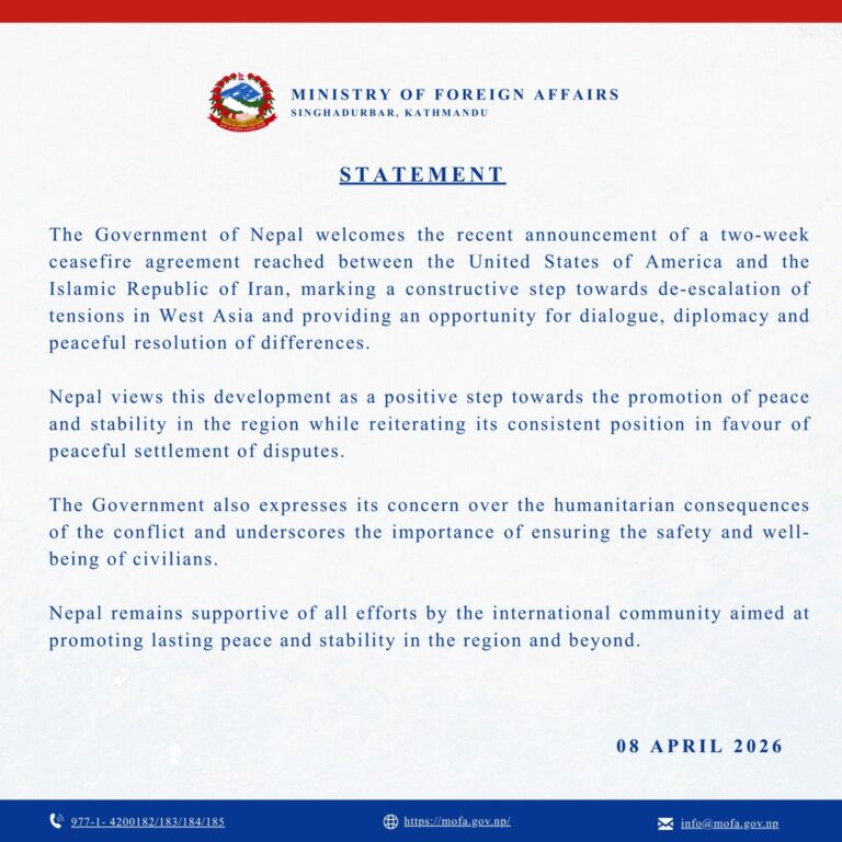 काठमाडौं । नेपालले अमेरिका र इरानबीच भएको युद्धविरामको स्वागत गरेको छ । बुधबार परराष्ट्र मन्त्रालयले विज्ञप्ति जारी गरी पश्चिम एसियामा भएको युद्धविराम सम्झौताको स्वागत गरेको हो । नेपालले युद्धविराम सम्झौतालाई उक्त क्षेत्रमा शान्ति र स्थिरताको प्रवद्र्धनतर्फ सकारात्मक कदमको रूपमा हेरेको जनाएको छ ।