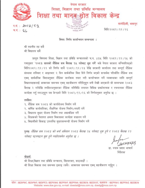 केन्द्रले शैक्षिक सत्र २०८३ को भर्ना अभियान वैशाख १५ देखि सुरु हुने र नियमित पठनपाठन भने वैशाख २१ गतेदेखि सञ्चालन हुने गरी व्यवस्था मिलाउन सबै स्थानीय तह र विद्यालयलाई अनुरोध गरेको छ ।