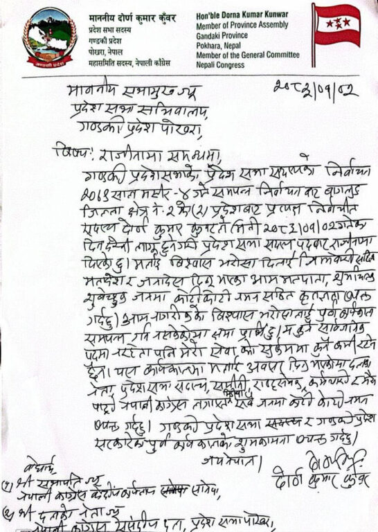 राजीनामा पत्रमा उनले लेखेका छन्,‘मलाई विश्वास भरोसा दिलाइ जिम्मेवारी सहित मतादेश र जनादेश दिनु भएका आममतदाता, शुभचिन्तक शुभेच्छुक जनमा कोटीकोटी नमनसहित कृतज्ञता व्यक्त गर्दछु । आम नागरिकको विश्वास भरोसालाई पूर्ण कार्यकाल सम्पन्न गर्न नसकेकोमा क्षमा प्रार्थी छु ।’
