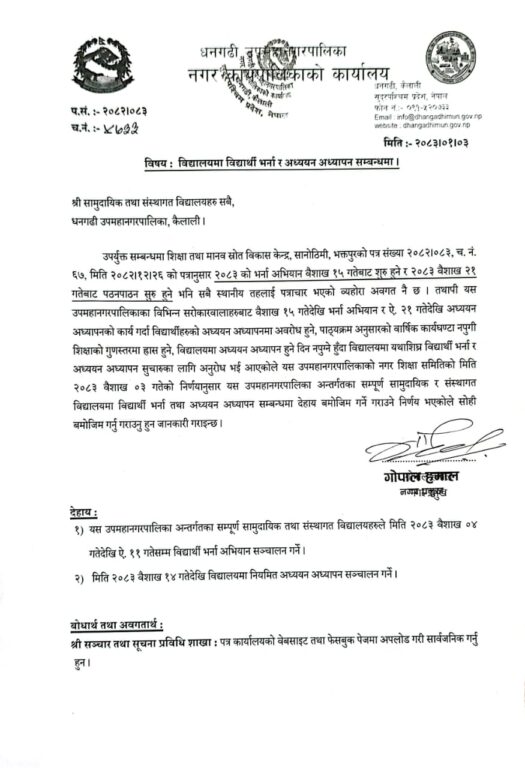 काठमाडौं । कैलालीको धनगढी उपमहानगरपालिकाले शुक्रबारदेखि विद्यार्थी भर्ना अभियान सञ्चालन गर्न विद्यालयहरूलाई निर्देशन दिएको छ ।