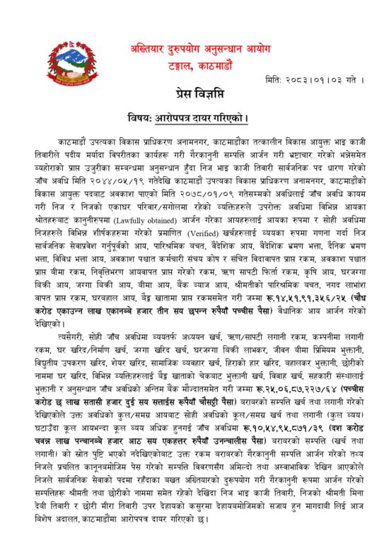 काठमाडौं । अख्तियार दुरुपयोग अनुसन्धान आयोगले काठमाडौं उपत्यका विकास प्राधिकरणका पूर्वआयुक्त डा. भाइकाजी तिवारीविरुद्ध भ्रष्टाचार मुद्दा दायर गरेको छ । अख्तियारले बिहीबार तिवारीविरुद्ध विशेष अदालतमा मुद्दा दायर गरेको हो ।