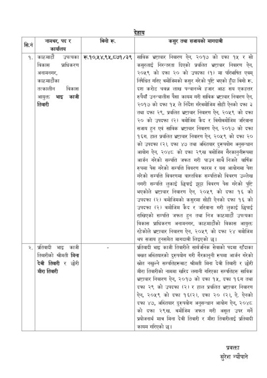 आय-व्यय हिसाब गर्दा १० करोड ५४ लाख ९५ हजार ८७१ रूपैयाँ बराबरको सम्पत्ति गैरकानुनीरूपमा आर्जन गरेको अख्तियारले जनाएको छ ।