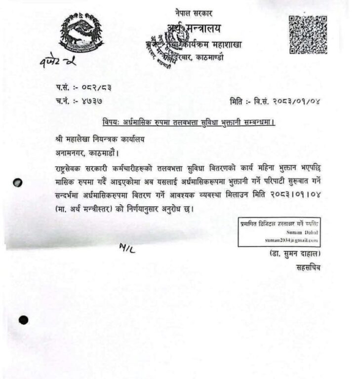 अर्थ मन्त्रालयबाट जारी पत्रअनुसार यो व्यवस्था कार्यान्वयनका लागि महालेखा नियन्त्रक कार्यालयलाई आवश्यक तयारी गर्न निर्देशन दिइएको छ ।