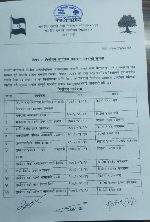 काठमाडौं । नेपाली कांग्रेसले शुक्रबार संसदीय दलको नेता चयन गर्ने भएको छ । निर्वाचन समितिले शुक्रवार दलको नेताको निर्वाचन गर्नेगरी निर्वाचन कार्यतालिका सार्वजनिक गरेको हो ।