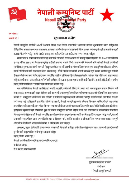 नेपाली कम्युनिष्ट पार्टीको ७७औँ स्थापना दिवस तथा लेनिन जयन्तीको अवसरमा शुभकामना व्यक्त गर्दै प्रचण्डले कम्युनिष्ट आन्दोलनले मात्र उपेक्षित र उत्पीडित समुदायहरूको अधिकार र राष्ट्रिय स्वाधीनताको वास्तविक संरक्षण गर्न सक्छ भन्ने इतिहासले प्रमाणित गरेको बताएका हुन् ।