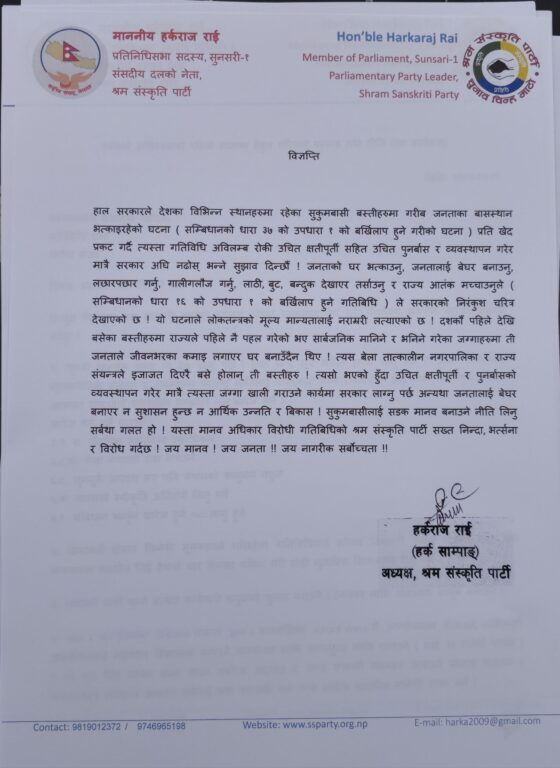 विज्ञप्तिमा भनिएको छ, ‘हाल सरकारले देशका विभिन्न स्थानहरुमा रहेका सुकुम्बासी बस्तीहरुमा गरीब जनताका बासस्थान भत्काइरहेको घटना (संविधानको धारा ३७ को उपधारा १ को बर्खिलाप हुनेगरीको घटना) प्रति खेद प्रकट गर्दै त्यस्ता गतिविधि अविलम्ब रोकी उचित क्षतिपूर्तिसहित उचित पुनर्बास र व्यवस्थापन गरेर मात्रै सरकार अघि बढोस् भन्ने सुझाव दिन्छौं ।’