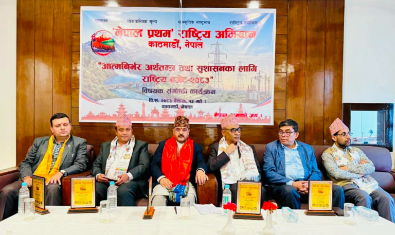 ’राष्ट्रिय दायित्वमा नेपाल प्रथम’ भन्ने मूल नारासहित नेपाल प्रथम राष्ट्रिय अभियानद्वारा आयोजित संगोष्ठीमा राष्ट्रको आर्थिक दिशा, बजेट निर्माणका प्राथमिकता तथा आत्मनिर्भर अर्थतन्त्र निर्माणका उपायबारे गम्भीर बौद्धिक बहस गरिएको थियो ।