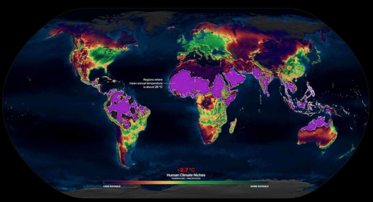 यो चित्र एकपल्ट राम्रोसँग हेर्नुस् । तापक्रम वृद्धि जम्मा २.७ डिग्री मात्रै हुने हो भने पनि यसमा भण्टा रङ लागेको विशाल क्षेत्र अहिले सहाराको मध्यभागजत्तिकै तातो हुनेछ । अर्थात् त्यहाँ बसोबास गर्ने ३.५ अर्ब मानिसहरु सन् २०७० अघि नै विस्थापित भइसकेका हुनेछन् । धेरै देशका वैज्ञानिक मिलेर गरेको यो अध्ययनको पूरा पाठ (Future of the human climate niche) पढ्नुहुन्छ भने उक्त आलेखको लिंक छ ।