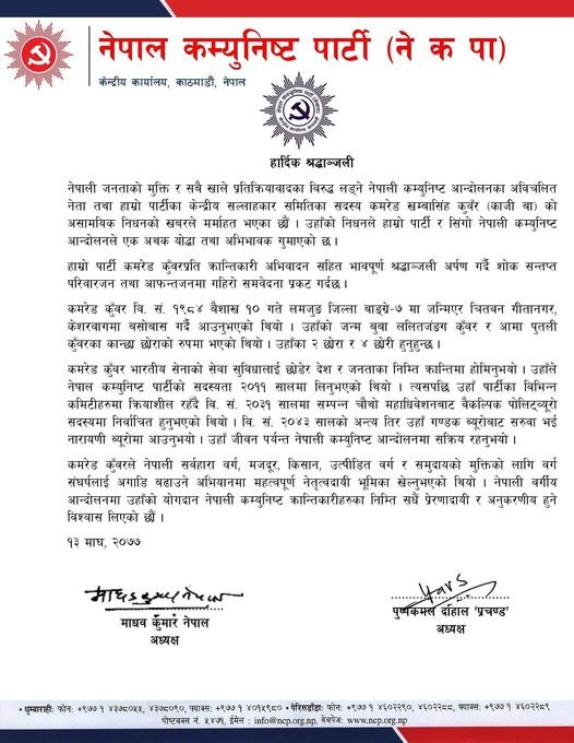 मधुमेह, रक्तचाप, प्रोस्टेट लगायतका स्वास्थ्य समस्या बेहोरिरहेका काजीबाको भरतपुर अस्पतालमा उपचाररत अवस्थामा निधन भएको हो । उनी नेपाल कम्युनिष्ट पार्टी (नेकपा) का केन्द्रीय सल्लाहकार थिए । कुँवर वि. सं. १९८४ बैशाख १० गते लमजुङ जिल्ला बाङ्ग्रे–७ मा जन्मिएर चितवन गीतानगर, केशरवागमा बसोबास गर्दै आएका थिए ।