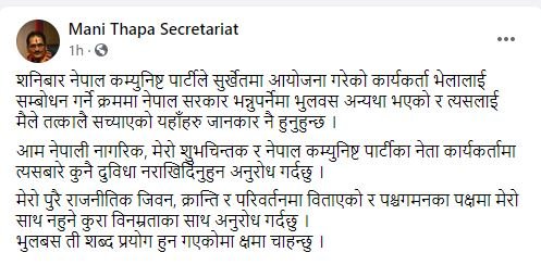 उनले समामाजिक संजाल फेसबुकमार्फत थापाले लेखेका छन्, ‘शनिबार नेपाल कम्युनिष्ट पार्टीले सुर्खेतमा आयोजना गरेको कार्यकर्ता भेलालाई सम्बोधन गर्ने क्रममा नेपाल सरकार भन्नुपर्नेमा भुलवस अन्यथा भएको र त्यसलाई मैले तत्कालै सच्याएको यहाँहरु जानकार नै हुनुहुन्छ । आमनेपाली नागरिक, मेरो शुुभचिन्तक र नेपाल कम्युनिष्ट पार्टीका नेता कार्यकर्तामा त्यसबारे कुनै दुविधा नराखिदिनुहुन अनुरोध गर्दछु । मेरो पुरै राजनीतिक जिवन, क्रान्ति र परिवर्तनमा विताएको र पश्चगमनका पक्षमा मेरो साथ नहुने कुरा विनम्रताका साथ अनुरोध गर्दछु । भुलबस ती शब्द प्रयोग हुन गएकोमा क्षमा चाहन्छु ।’