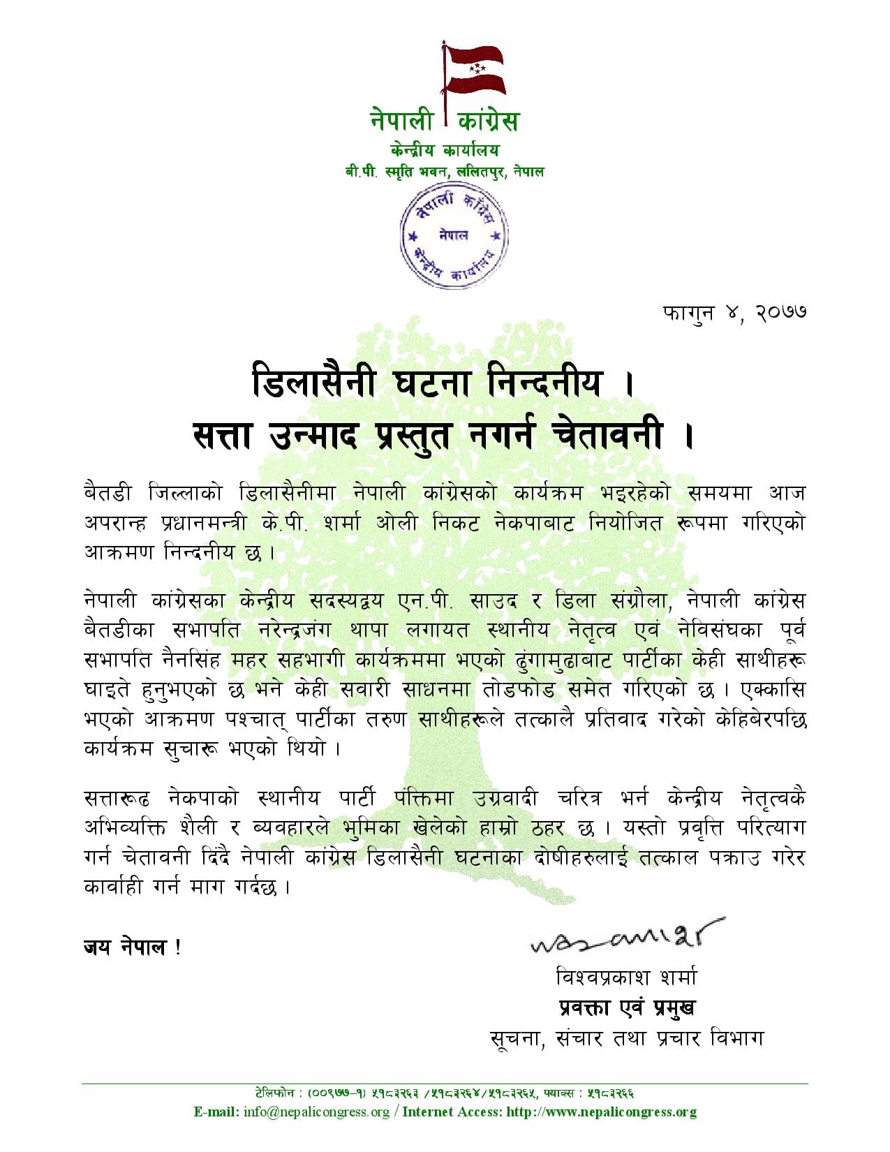 काठमाडौं । नेपाली कांग्रेसले बैतडीको डिलासैनीमा प्रधानमन्त्री केपी ओली समूहबाट नियोजित रूपमा गरिएको आक्रमण गरिएको भन्दै आपत्ति जनाएको छ ।