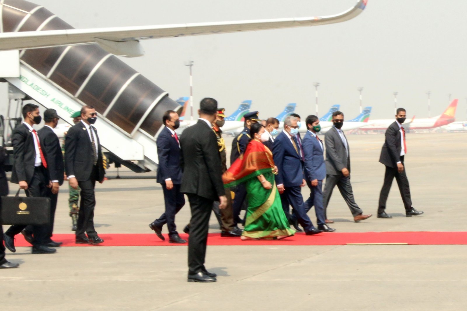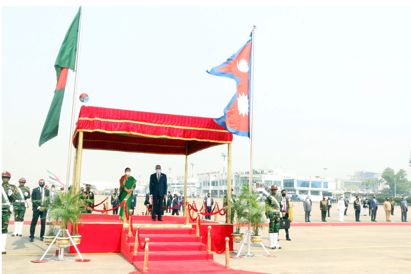 बङ्गलादेशका राष्ट्रपिता शेख मुजिबुर रहमानको जन्मशताब्दी विशेष समारोहका अवसरमा बङ्गलादेशी राष्ट्रपति मोहम्मद अब्दुल हमिदका मैत्रीपूर्ण निमन्त्रणामा राष्ट्रपति भण्डारी बिहान स्थानीय समयानुसार १० बजे ढाकास्थित हजरत सहजलाल अन्तर्राष्ट्रिय विमानस्थलमा आइपुगेकी हुन् । राष्ट्रिय ध्वजावाहक नेपाल वायुसेवा निगम (नेपाल एयरलाइन्स) को विशेष विमानबाट यहाँ आइपुगेकी राष्ट्रपति भण्डारीलाई समकक्षी हमिदले विमानस्थलमा स्वागत गरे । ‘