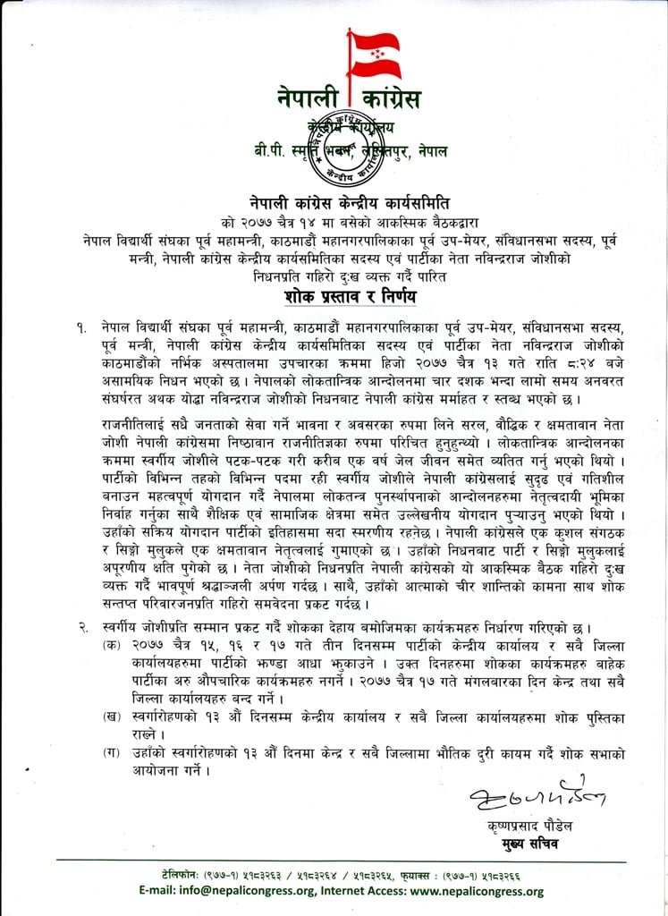 त्यसैगरी चैत्र १७ गते मंगलबार केन्द्र तथा सबै जिल्ला कार्यालयहरु बन्द गर्ने बैठकले निर्णय गरेको पार्टीका मुख्य सचिव कृष्णप्रसाद पौडेलले जानकारी दिएका छन् । त्यस्तै जोशीको स्वर्गारोहणको १३ औँ दिनमा केन्द्र र सबै जिल्लामा भौतिक दुरी कायम गर्दै शोक सभाको आयोजना गर्ने बैठकले निर्णय गरेको छ । जोशीको काठमाडौंको नर्भिक अस्पतालमा उपचारका क्रममा शुक्रबार राति निधन भएको थियो ।