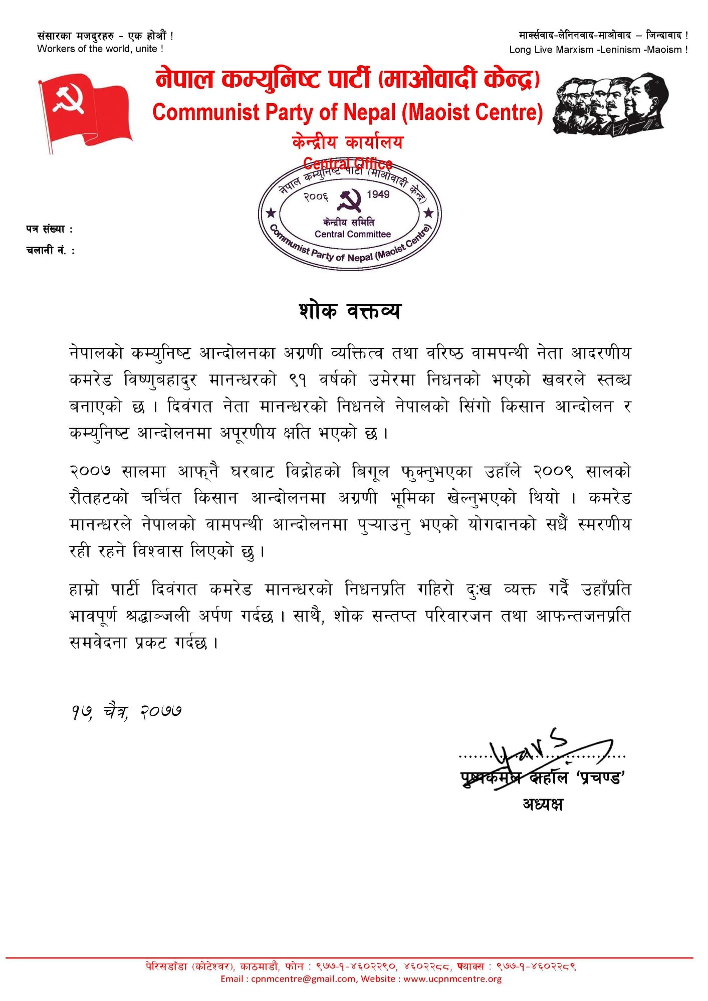 मंगलबार बिहान शोक वक्तव्य जारी गरी अध्यक्ष प्रचण्डले मानन्धरले नेपालको वामपन्थी आन्दोलनमा पुर्याएको योगदान सधैं स्मरणीय रहिरहने बताएका हुन् ।
